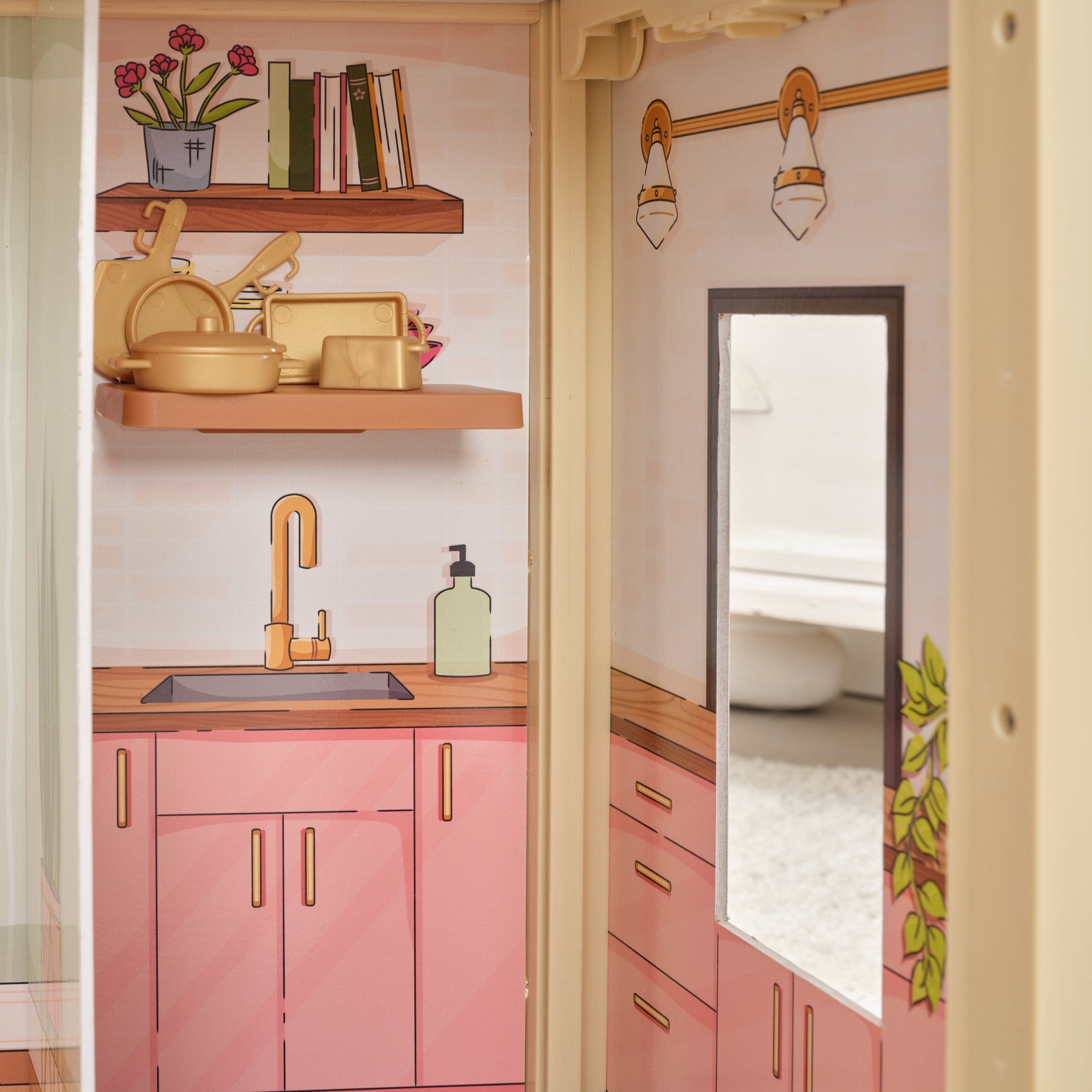 • Cutout doors and windows combined with 4 insertable shelves integrated into the walls, facilitating more authentic and versatile doll play