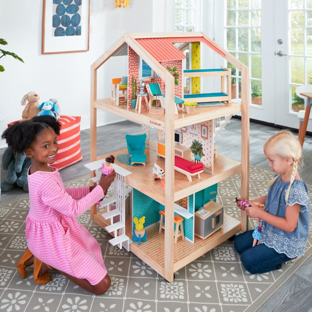 Inspire creativity and imaginative play with the sophisticated SwingsetPlus So Stylish Mansion, a retro-inspired dollhouse designed to engage children for hours. Standing nearly four feet tall, this spacious Mid-Century modern dollhouse features three expansive play levels and offers a full 360° of accessible play space, enabling multiple children to explore and interact simultaneously. Its wheeled base provides convenient mobility, allowing the dollhouse to be easily relocated to any room, enhancing playtime flexibility. Equipped with two movable staircases that can be securely clipped onto any floor, along with a comprehensive 42-piece furniture and accessory set, this dollhouse supports diverse storytelling and role-playing opportunities for 12” dolls. Parents will appreciate the efficient assembly process enabled by the innovative EZ Kraft Assembly™ technology, minimizing setup time and maximizing playtime.