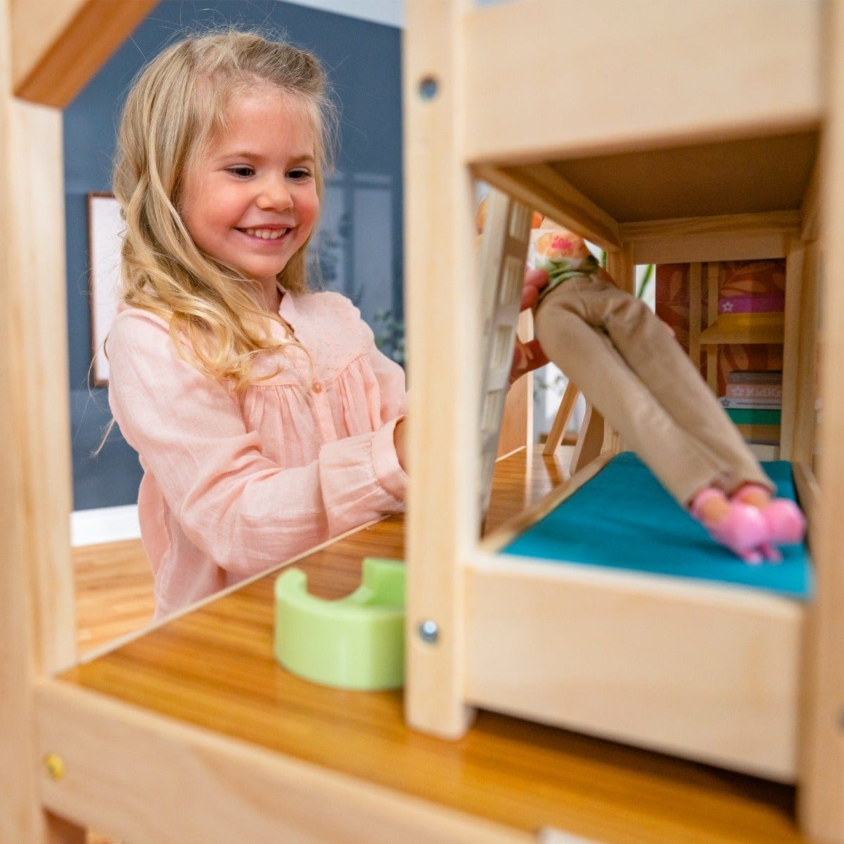 - Two moveable staircases that securely clip onto any floor within the dollhouse