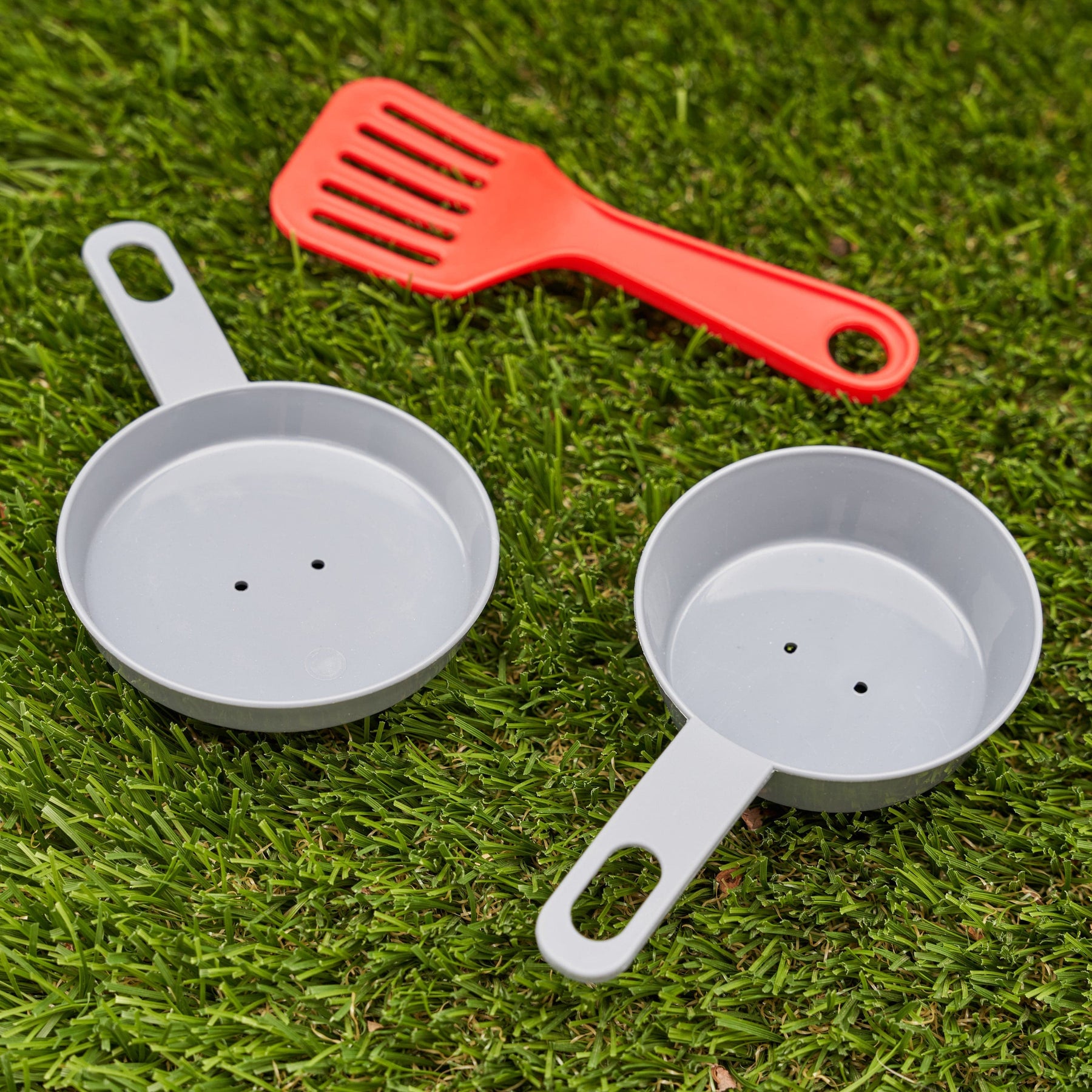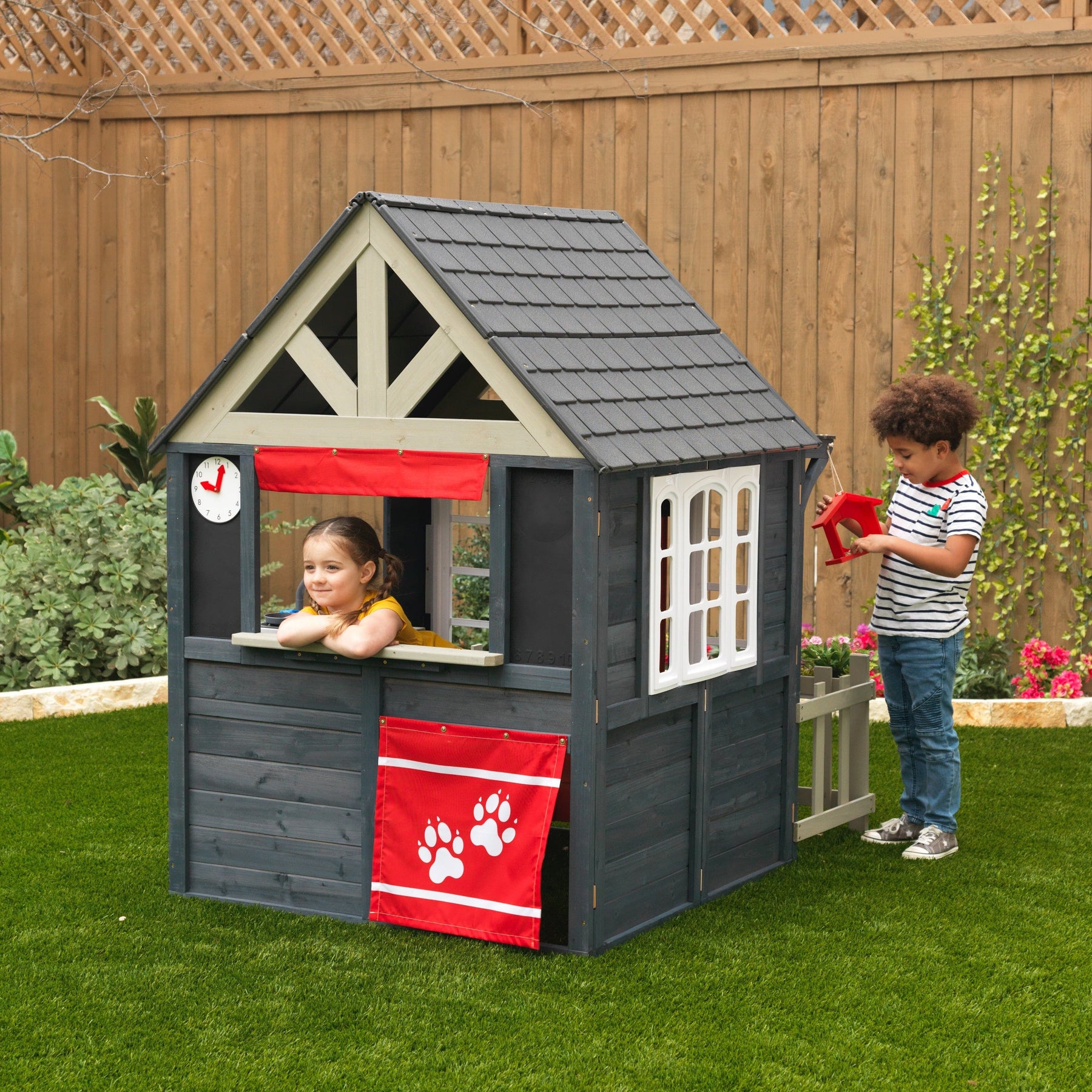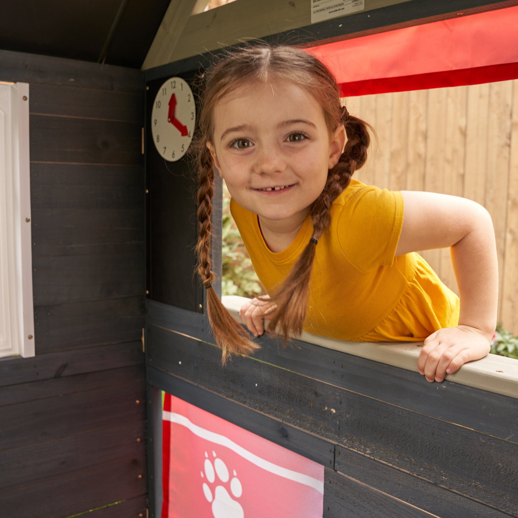 Inside, the playhouse is equipped with a kitchen sink, burner, and utensils, including a pot, pan, and spatula, enabling children to engage in creative cooking play. The spacious bay window at the back, complete with a covered fabric awning, serves as a versatile space for serving pretend meals or hosting puppet shows, enhancing the playhouse’s multifunctional appeal. Two creativity boards, accompanied by a clock, offer dedicated areas for artistic expression and learning, promoting cognitive development and fine motor skills. Please note that chalk is not included.
