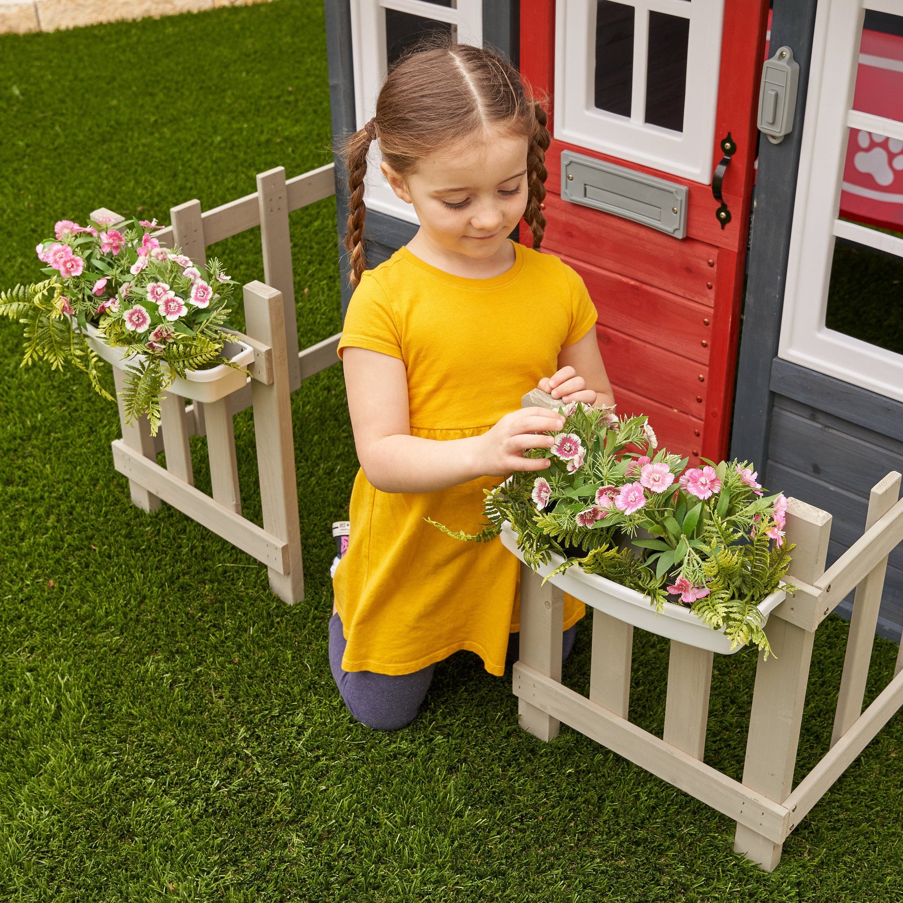 The front of the playhouse is enhanced with double planter boxes, ideal for cultivating flowers or herbs, fostering a connection with nature and encouraging responsibility through gardening activities. A hanging birdhouse invites local wildlife, allowing children to observe and interact with feathered visitors by filling it with birdseed. The vinyl flap door offers a playful entryway for pets—real or imaginary—adding to the interactive elements of the playhouse. Additionally, the functional doorbell and mail slot provide realistic touches that stimulate role-playing and social interaction.