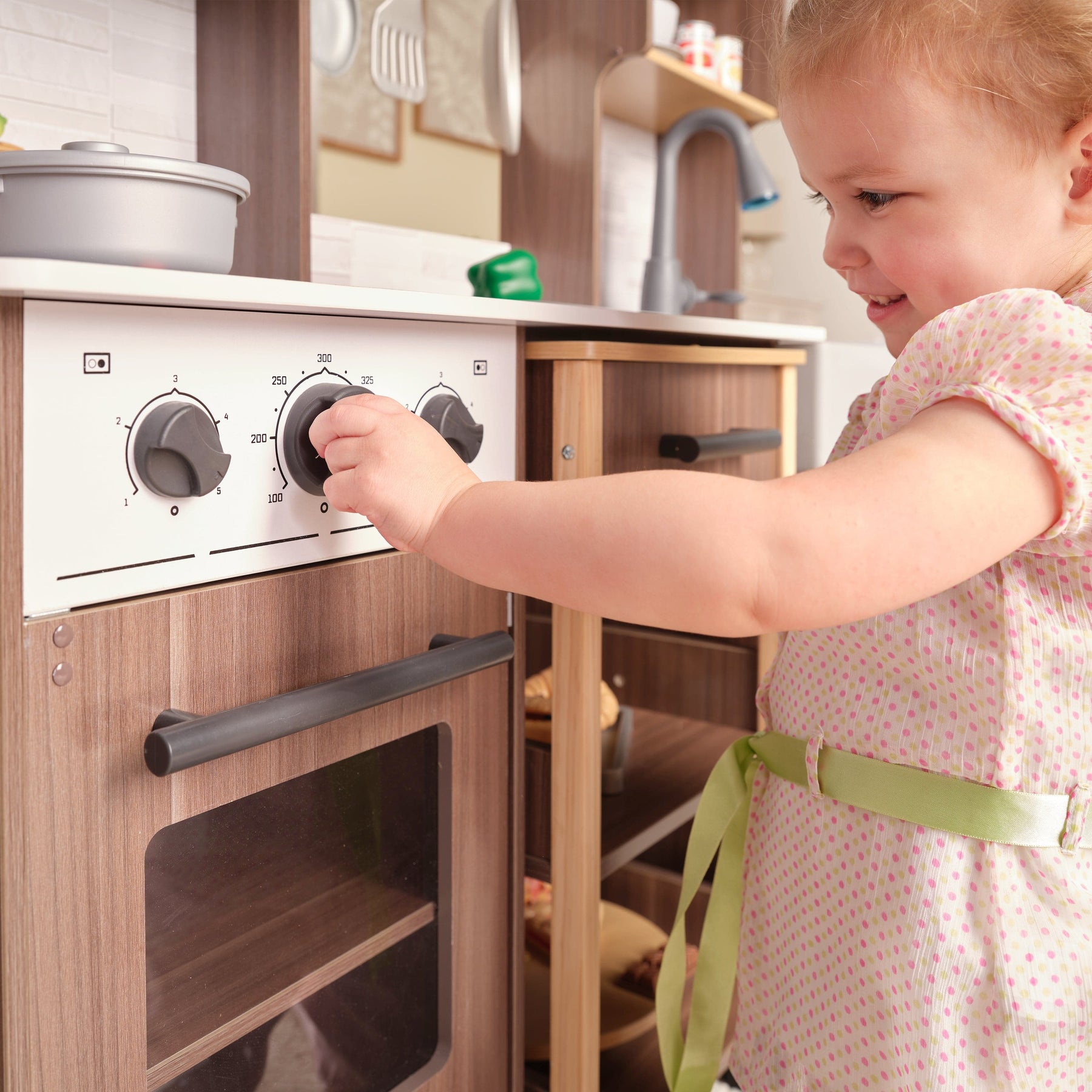 • Oven and microwave feature transparent windows; all appliances include pull handles and three click-and-turn knobs for interactive play