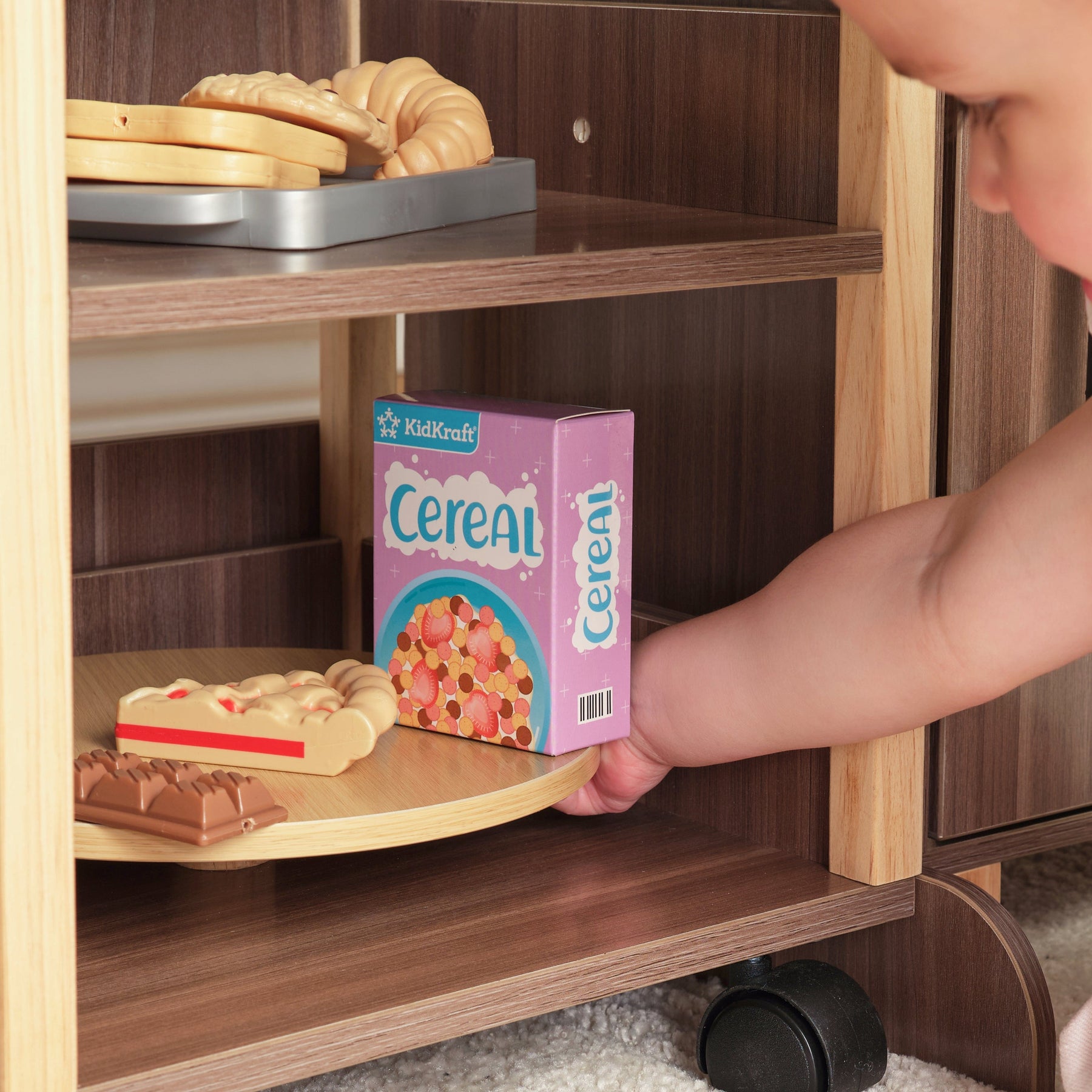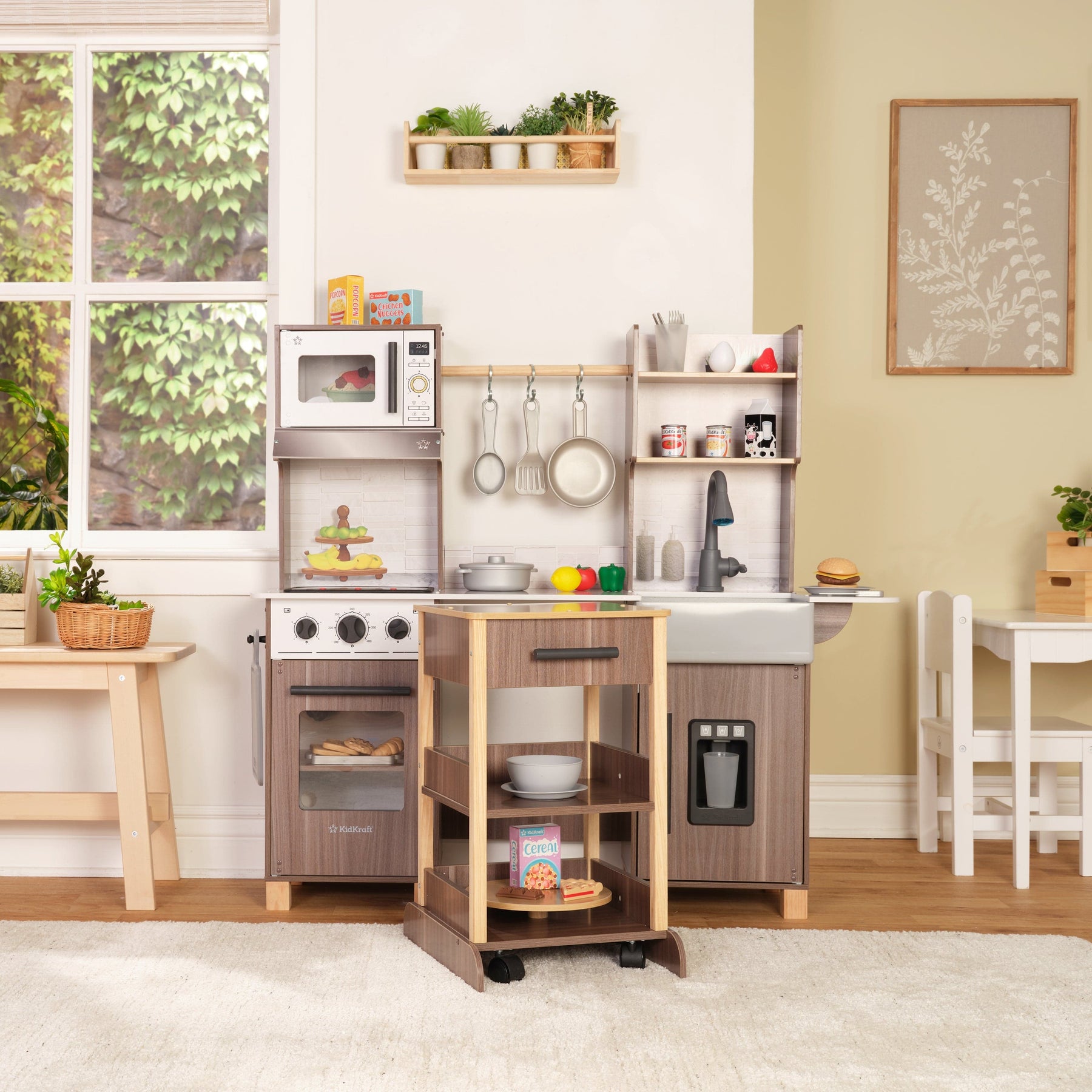 • Central island slides in and out to expand play space and conveniently stores away when not in use; includes a lazy Susan and storage shelf for organization