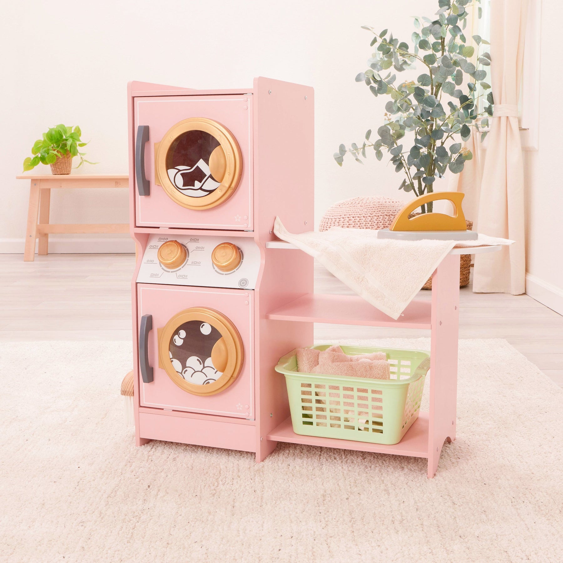 The set includes cabinets with doors that open and close smoothly, as well as inset circular windows adorned with playful bubbles and laundry-themed screenprints, adding to the authenticity of the experience. The control knobs turn with satisfying clicking sounds, enhancing the realistic feel. Children can simulate ironing with the extendable ironing board and accompanying play iron, while two shelves beneath the washer provide convenient space for folding clothes or storing the included laundry basket. Additionally, two side-mounted pegs securely hold the broom and dustpan, completing the set and encouraging tidiness.