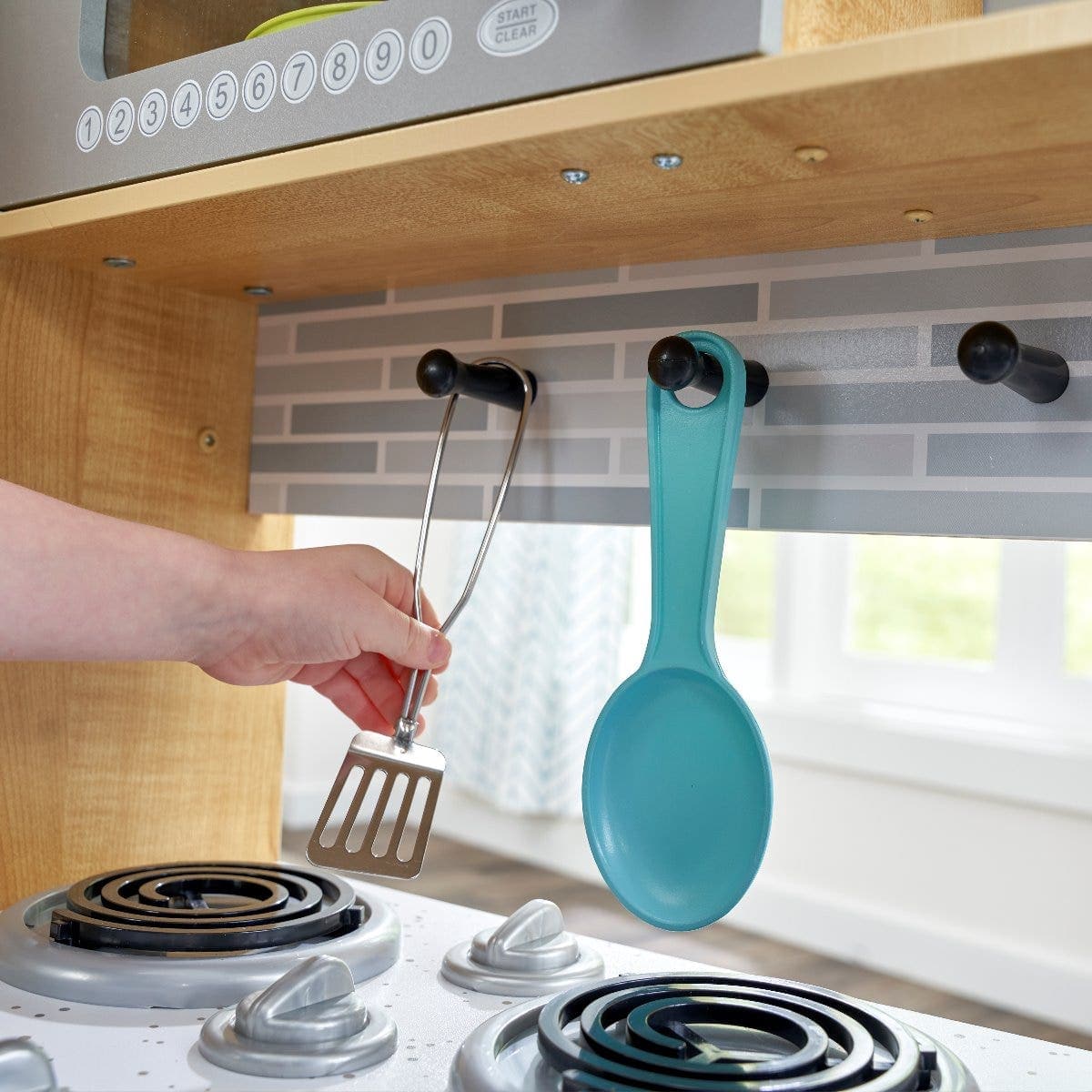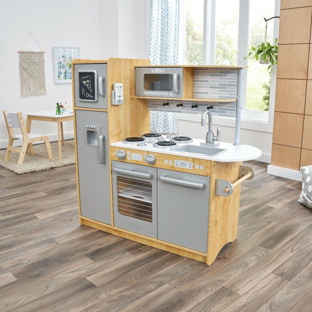Introduce young culinary enthusiasts to an engaging and realistic cooking experience with the SwingsetPlus Uptown Natural Play Kitchen. Designed with a contemporary aesthetic, this play kitchen features a tile-look backsplash and sleek countertops that mirror the sophistication of modern real-world kitchens. Each component is thoughtfully interactive, including functional doors that open and close smoothly, knobs that turn with an authentic click, and a practical chalkboard integrated into the freezer door for creative expression. The cordless play phone, conveniently attached to the refrigerator’s side, encourages imaginative communication. Additionally, the kitchen offers practical storage solutions such as utensil pegs and a side towel rack, ensuring all accessories remain organized and accessible. Constructed from durable wood and premium recyclable materials, the Uptown Natural kitchen provides a robust and stylish centerpiece for extended play sessions.
