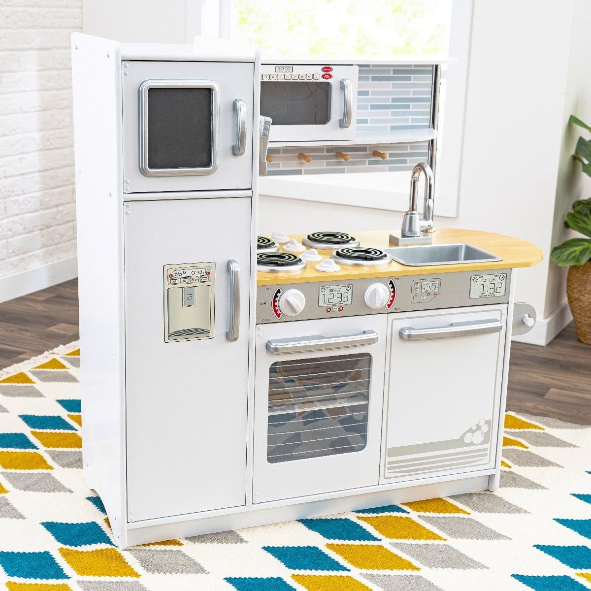 Introduce young chefs to an engaging and realistic culinary experience with the SwingsetPlus Uptown White Play Kitchen. Designed with a contemporary aesthetic, this play kitchen features a tile-look backsplash and sleek countertops that mirror the style of modern real-world kitchens. Each appliance is thoughtfully interactive, offering doors that open and close smoothly, knobs that turn with a satisfying click, and a functional chalkboard integrated into the freezer door for creative expression. The cordless play phone, conveniently attached to the refrigerator side, encourages imaginative communication. To maintain organization, the kitchen includes pegs for hanging utensils and a side towel rack, ensuring all accessories remain within easy reach. Constructed from durable wood and premium recyclable materials, the Uptown White kitchen combines sturdiness with style, making it a reliable and attractive addition to any playroom.