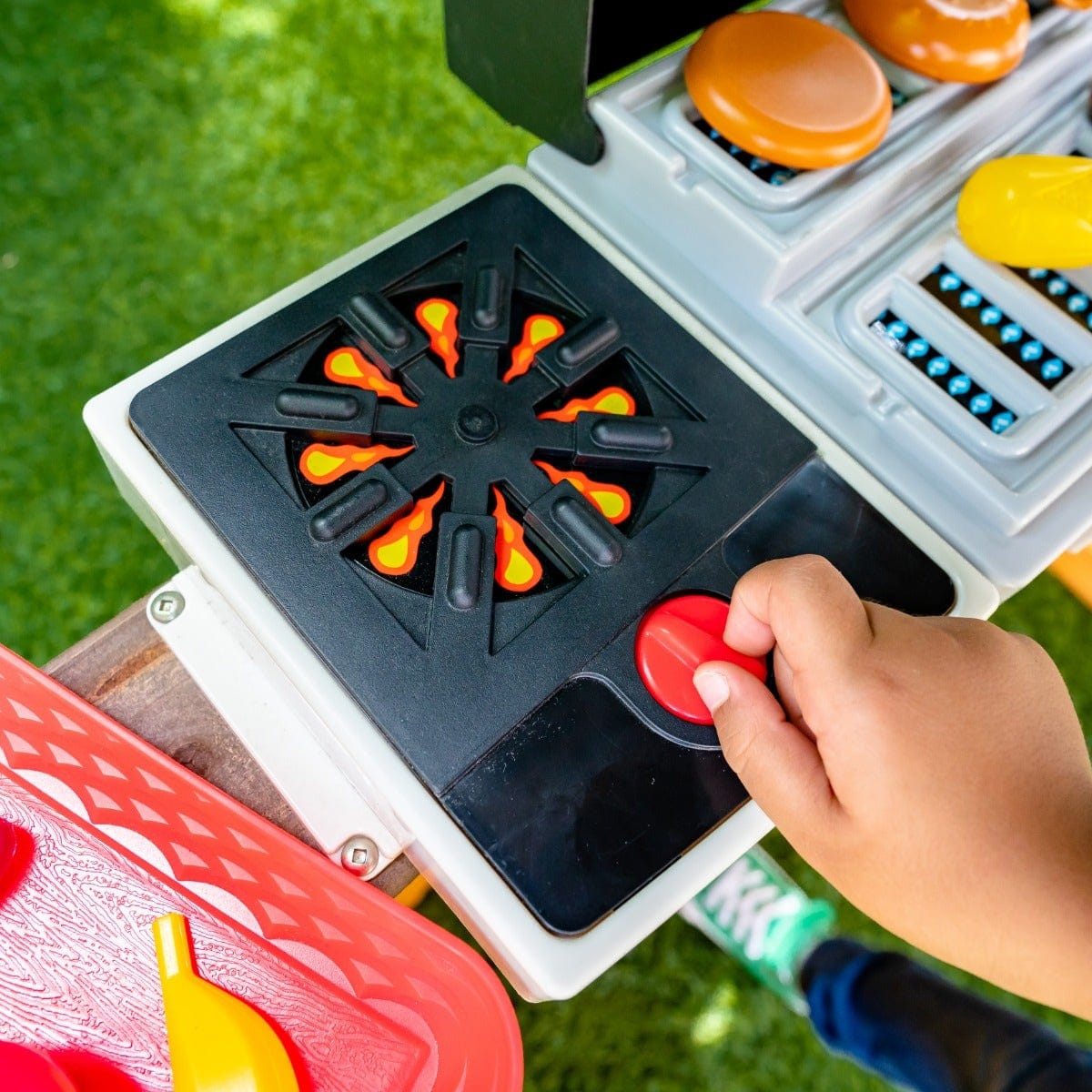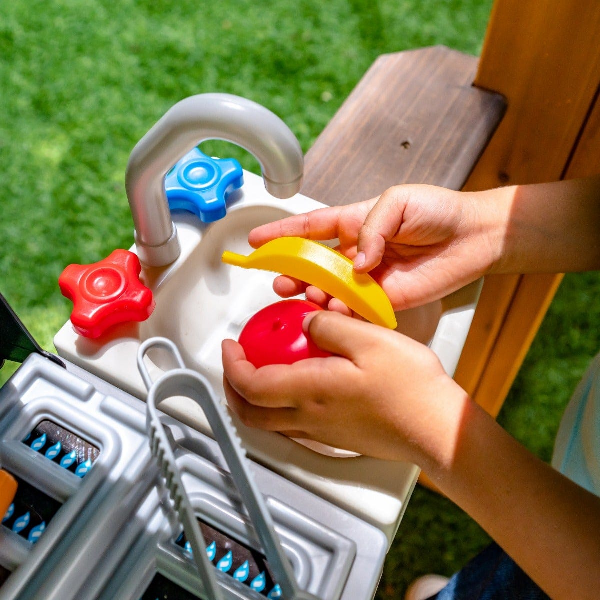 - Includes a ground-level playhouse with a door and doorbell, role play kitchen, bench, and counter to encourage imaginative play