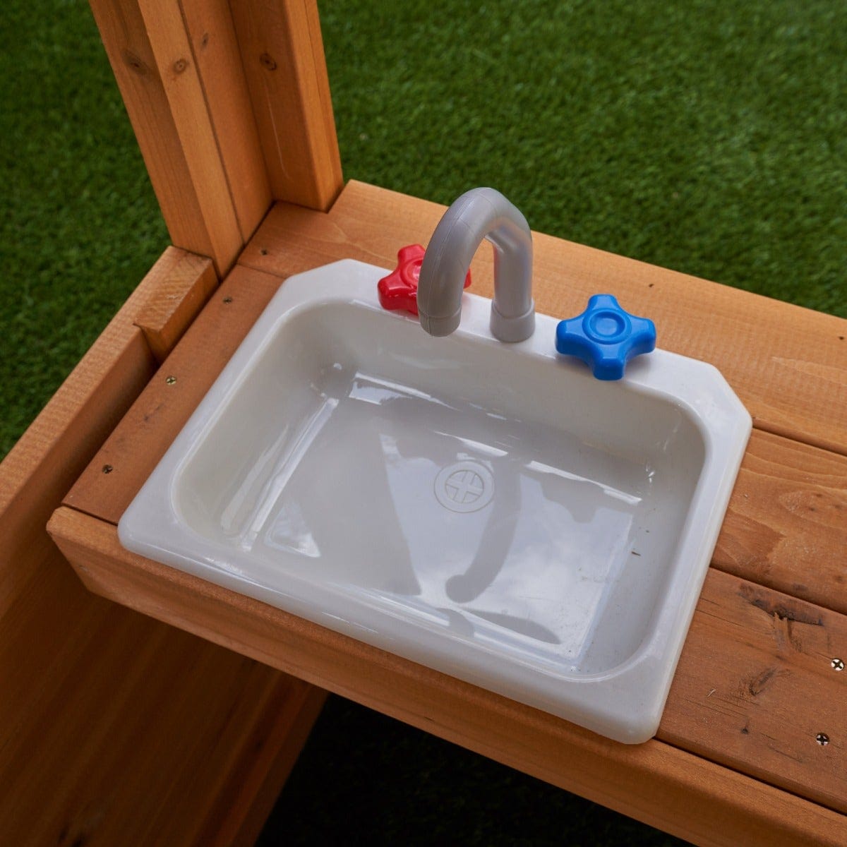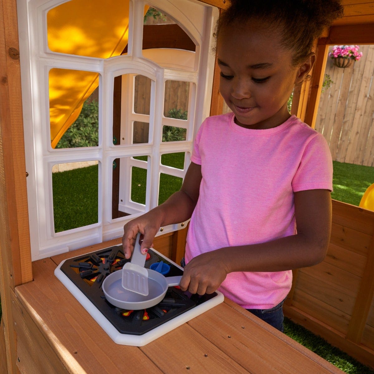 • Play kitchen including stove, sink and utensil shelf with accessories in lower clubhouse