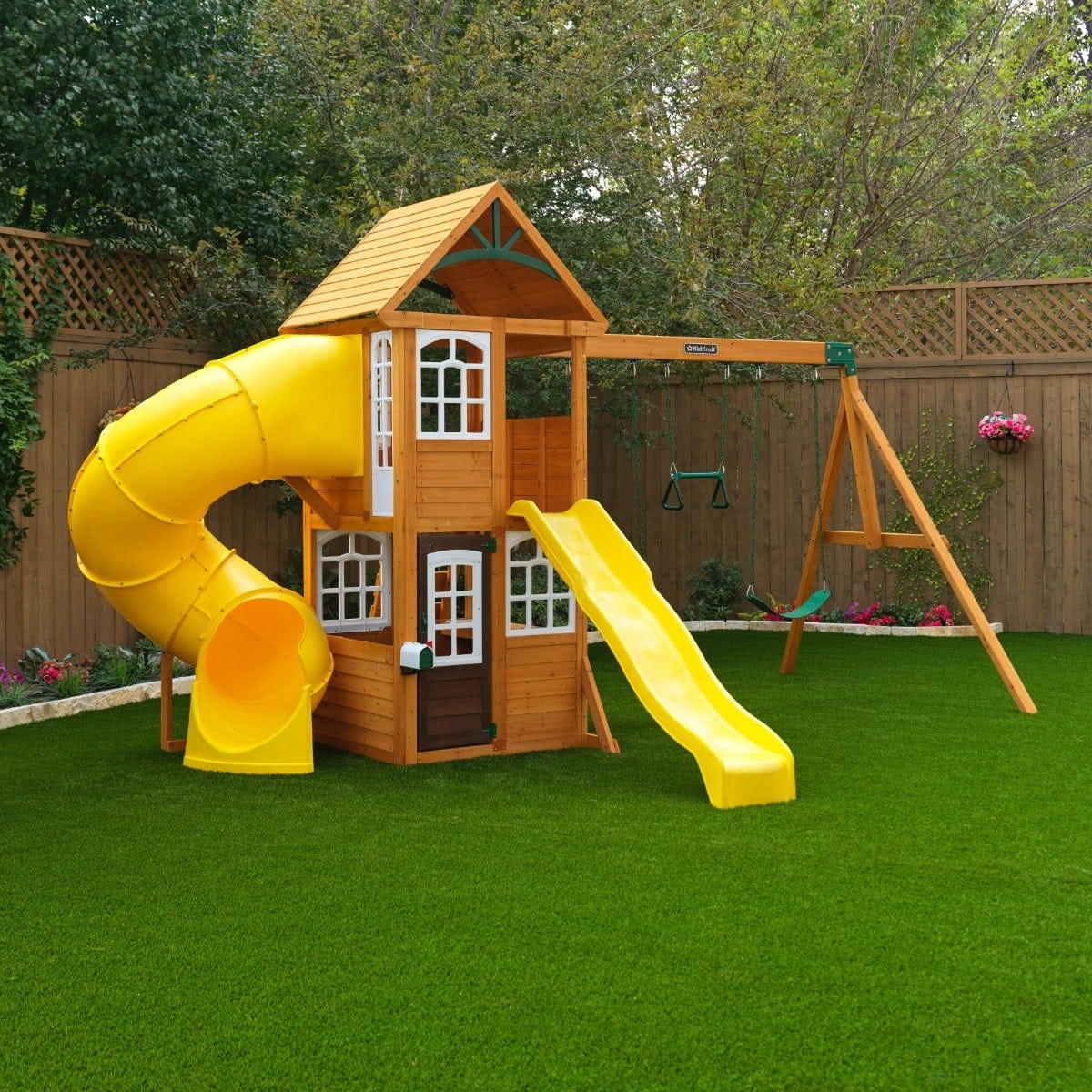 Provide children with a safe and engaging outdoor environment with the Castlewood Playset by SwingsetPlus, a superior play structure designed to accommodate up to 10 children simultaneously. This expansive playset encourages active outdoor play, promoting physical activity and imaginative interaction in a secure backyard setting. The lower-level clubhouse features a fully equipped play kitchen complete with stove, sink, and utensil shelf, allowing children to engage in creative role-playing. After imaginative playtime, children can ascend the sturdy wooden ladder to reach the upper clubhouse, fostering coordination and confidence.