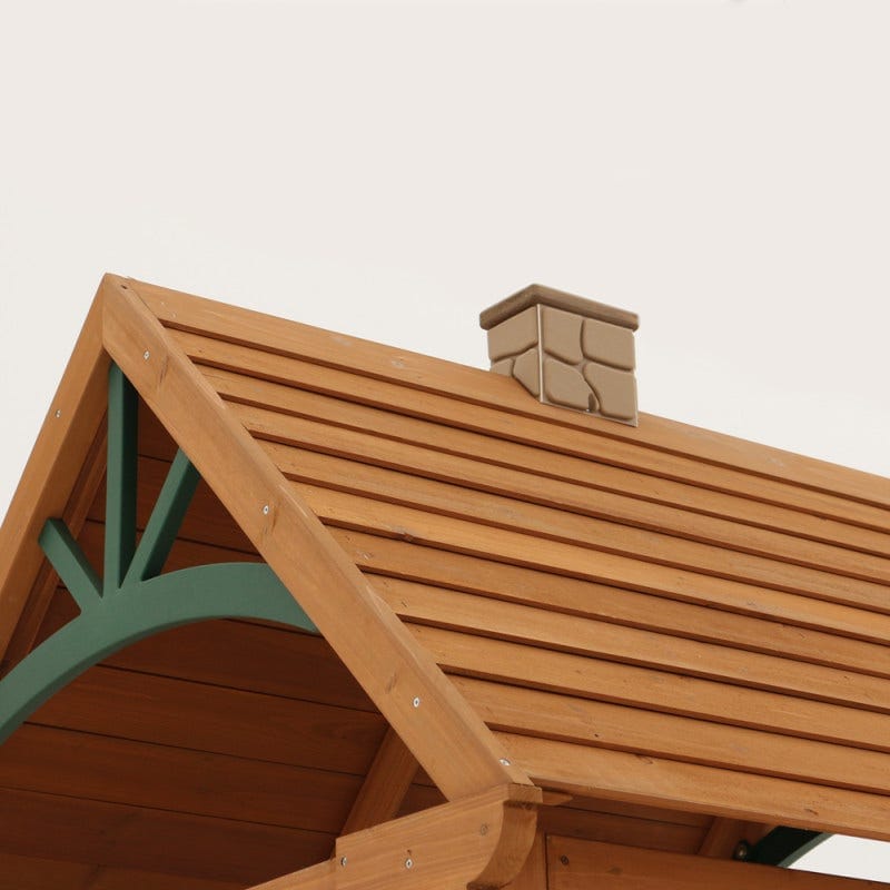 • Wooden shiplap roof with faux stone chimney