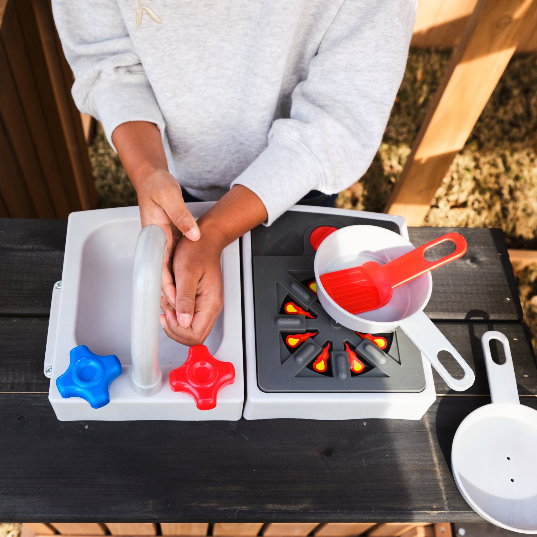- Includes a kitchen with sink, burner, and three utensils to encourage role-playing; ledge and bench for serving guests