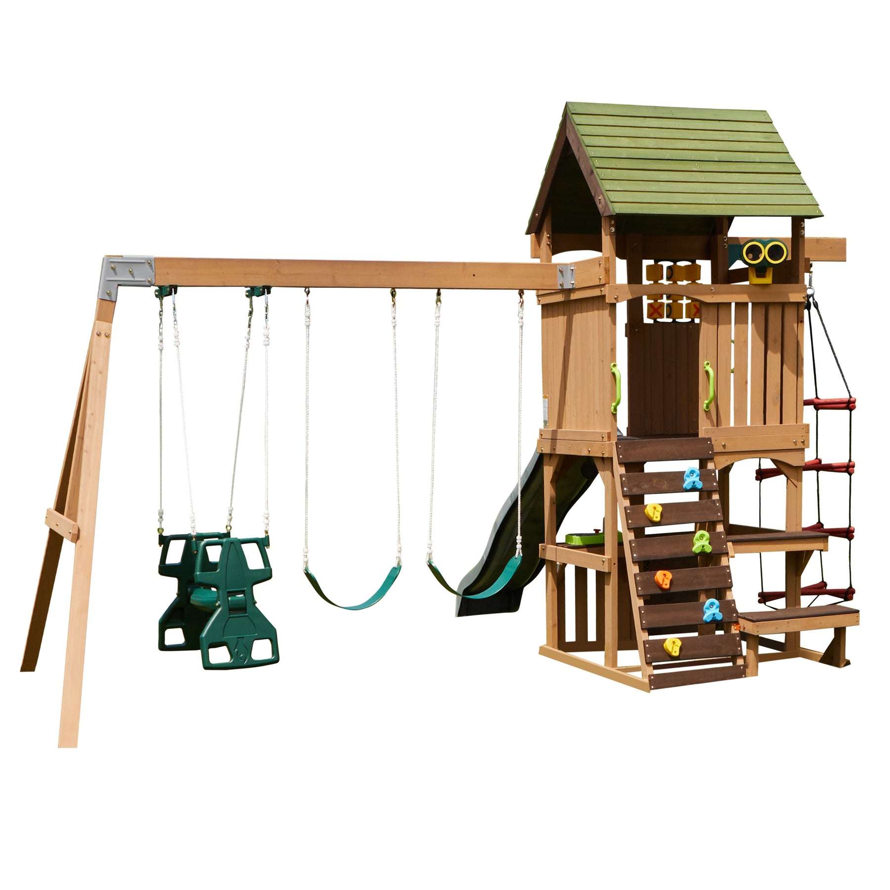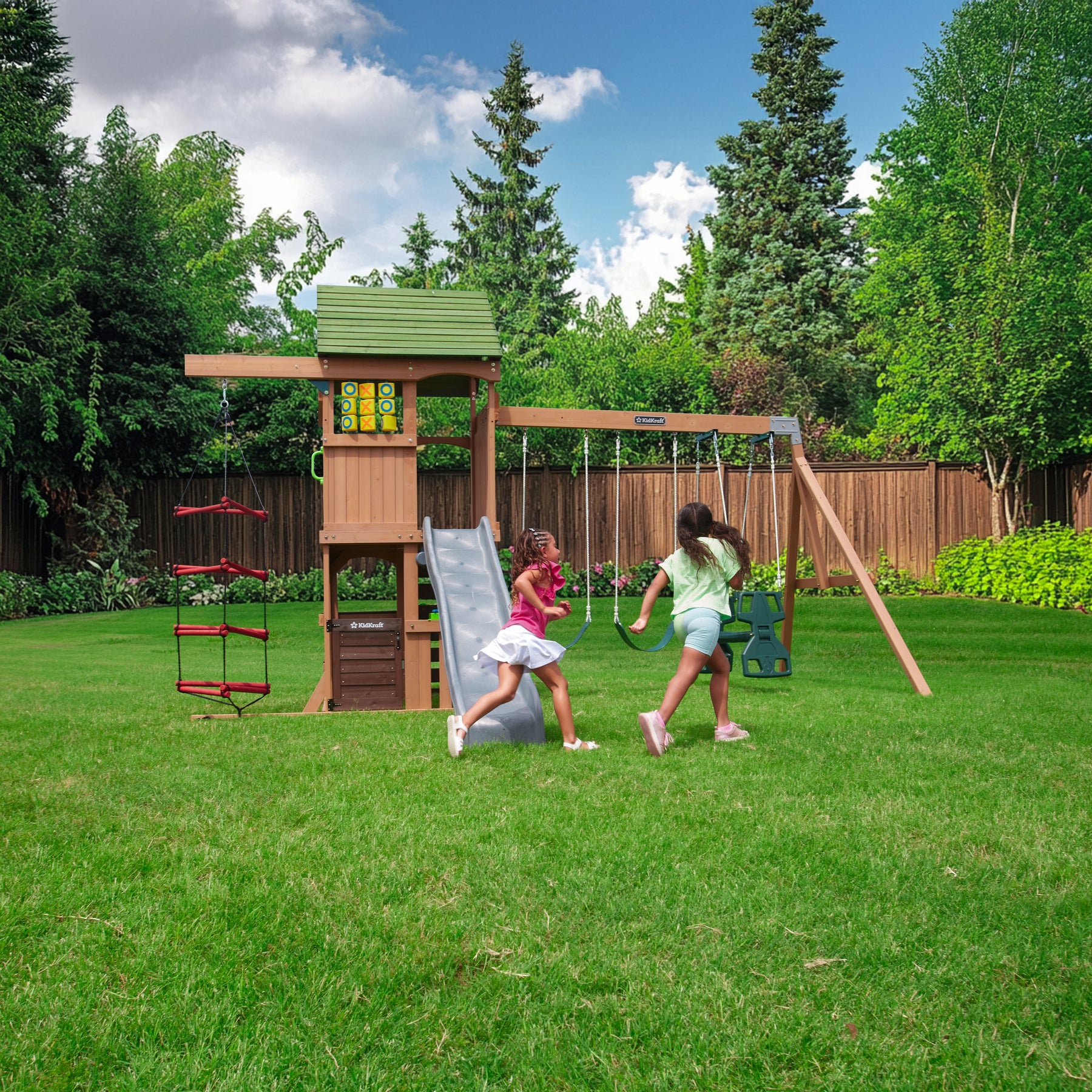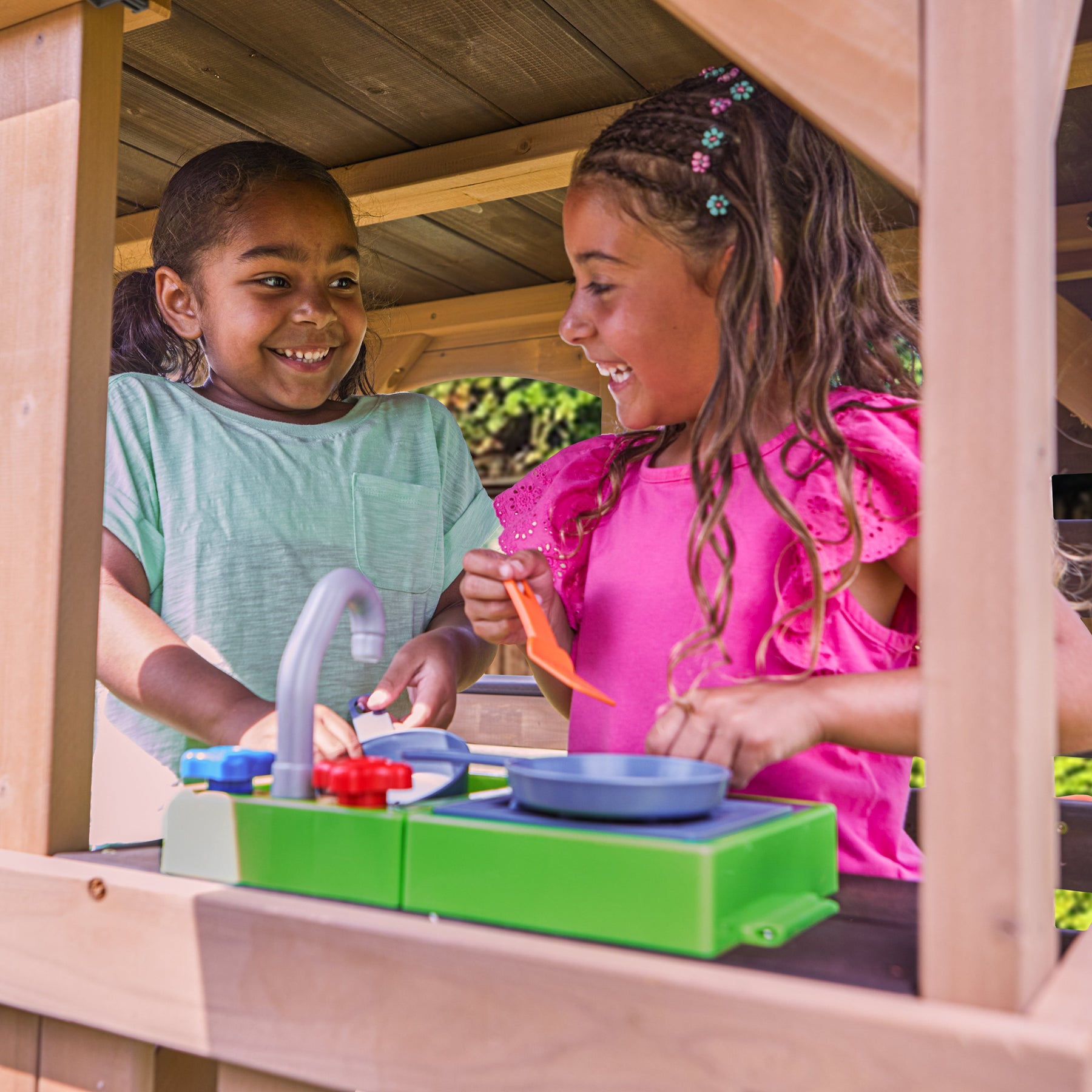 Provide your children with an enriching outdoor experience with the SwingsetPlus Summerside Swing Set, expertly designed for extended play in the backyard. This set features a distinctive steeple climber constructed from robust wooden dowels and thick braided rope, ensuring a secure and comfortable grip for young adventurers. The clubhouse’s roof is crafted from durable green wood, offering reliable shade for children as they engage in activities such as tic-tac-toe or use the attached telescope to explore their surroundings. Beneath the clubhouse, a picnic table invites kids to enjoy snacks, helping them recharge and sustain their energy for continued play. The built-in kitchen enhances imaginative play, equipped with a sink featuring red and blue faucet knobs to indicate hot and cold water. The burner includes fire-inspired graphics that activate with the turn of a knob, complemented by a pan, pot, and spatula for hands-on interaction. A half door completes the homelike ambiance, fostering creative role-play scenarios.