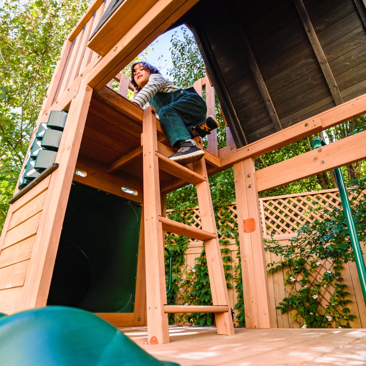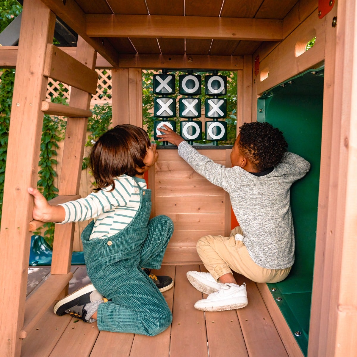 • Rock wall ladder leads to the second level featuring a tic-tac-toe game and a crow's nest with telescope for observation and creative exploration