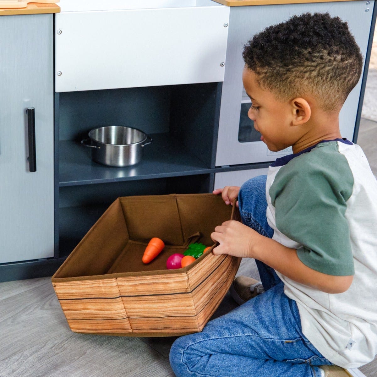 • Two collapsible wood-print fabric storage bins provide practical storage solutions